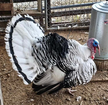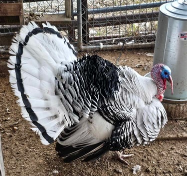 When we decided to add a few turkeys, we knew we had to get the Royal Palms. Our Tom is very friendly and the hens are great moms and great layers! We have a limited supply of fertilized eggs in the spring and then poults from day old to older available from late spring to fall.